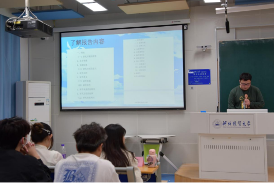 活动伊始,安雨菲同学从科研赛事的总体出发,以幽默风趣的语言,浅显易懂的例子向同学们重点介绍了“挑战杯”中国大学生创业计划竞赛、大学生课外学术科技作品竞赛、节能减排、调研河北和冀青调研、互联网+大学生创业大赛五大赛事。她围绕参赛要求、比赛赛制以及赛事安排等方面对各种竞赛的情况进行了具体阐述,同学们对各类科研比赛有了更加深入的了解。