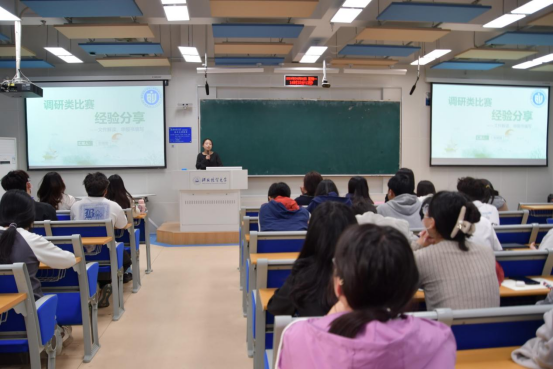 紧接着,张欣同学分享了他在科创竞赛中获取的宝贵经验,他以“如何让人眼前一亮——浅谈调研类比赛结项报告写作”为主题,向同学们强调了结项报告中同学们应做到背景与设计短小精悍,过程与分析真实科学,结论与方案独具特色,体现出方案的针对性,形成调研特色,从而才会突出鲜明的主题。