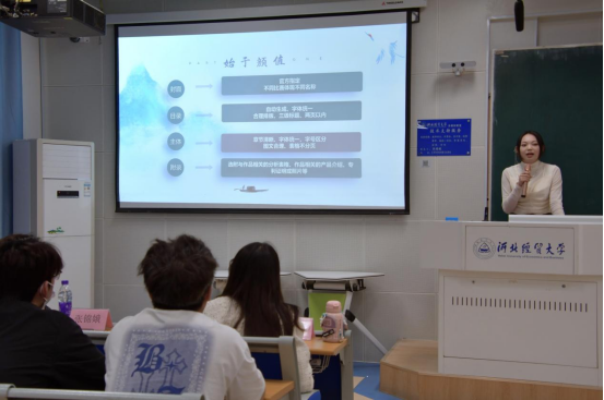 随后,屈净源同学进行分享,她认为出色的作品背后离不开踏实的内心,好的领导者,创意的点子和靠谱的团队;之后,她更是从个人心理路程出发,为同学们分享计划书的撰写技巧以及路演的重要意义。